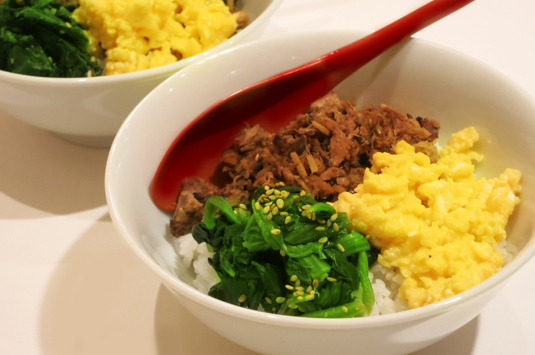 また、青み野菜は、生でなくゆでて、下味をつけたものが食感的に合うようです。写真では、ゆでほうれんそうを、ごま油+塩+さとう+おろしにんにくで和えたものを使っています。