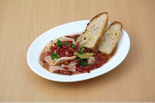 インゲン豆を缶汁ごと加え、軽く煮込む。塩・こしょうで調味し、盛りつける。オリーブオイルを振り、パン(分量外)を添える。