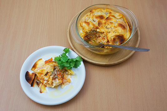 オーブンを、200℃に温めておく。さば缶は、缶汁ごと、一口大程度に、ざっとほぐす。