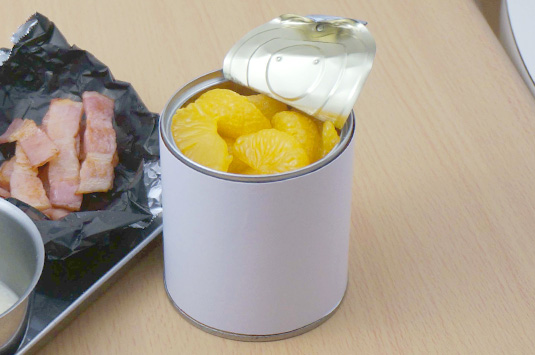 みかん缶の缶汁を切る。