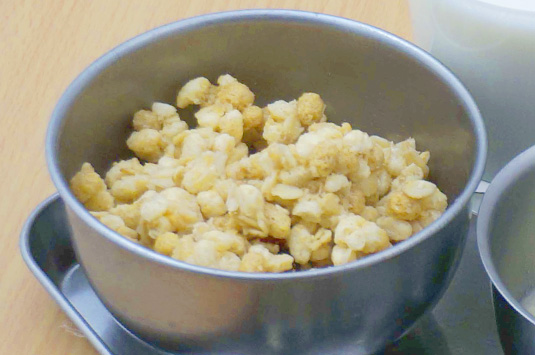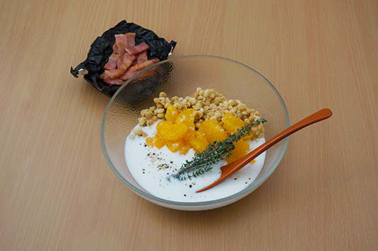 皿に、グラノーラと飲むヨーグルトを盛りつける。
